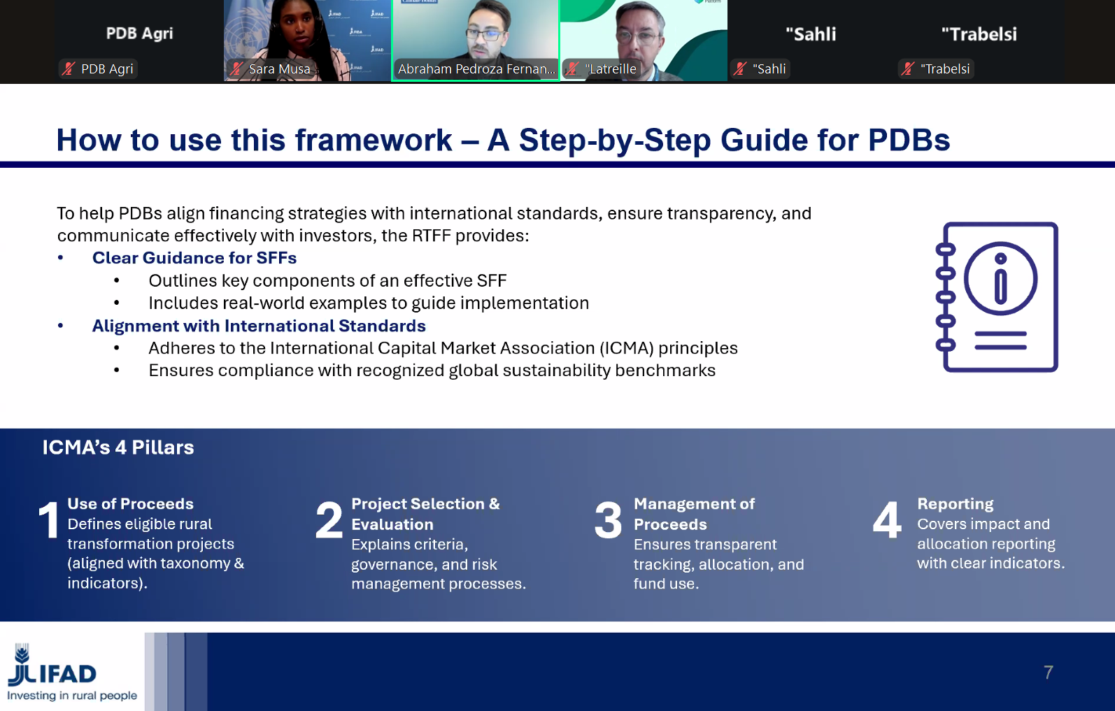 Thierry Latreille (plateforme Agri-PDB) a présenté le RTFF comme une réponse aux attentes des investisseurs en matière de cadres crédibles, de critères d’éligibilité rigoureux, de processus de sélection transparents et de rapports solides, tout en tirant les leçons du webinaire de l’année précédente sur les obligations d’adaptation climatique des BPDs. Il a souligné l’alignement du RTFF sur les principes de l’ICMA et les ODDs, ainsi que son potentiel à mobiliser des capitaux privés et à renforcer la confiance du marché pour les BPD.